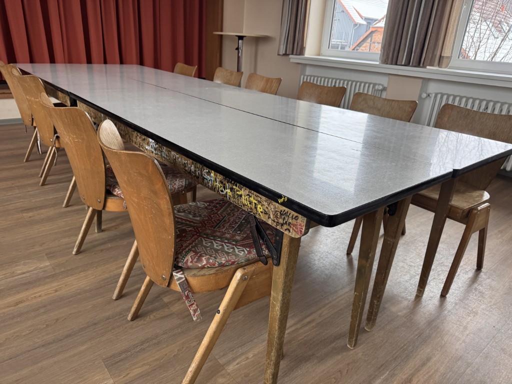 Der Raum war immer sauber und mit viel Liebe gepflegt, aber die Tische waren nicht nur beschmiert, sondern auch sehr brüchig, die Schränke ein Stückwerk und der Bühnenteil eher ein Lager als eine nutzbare Fläche.